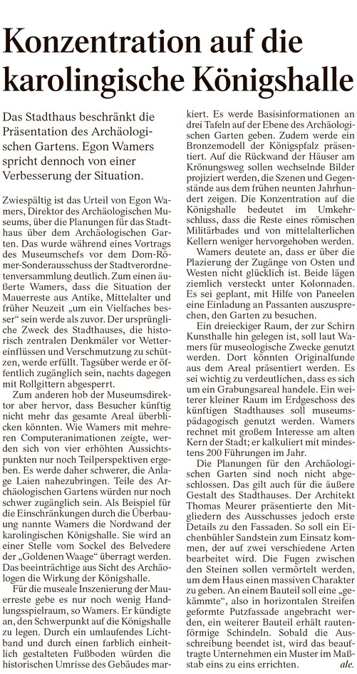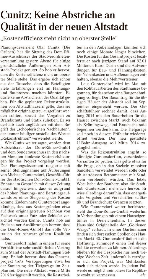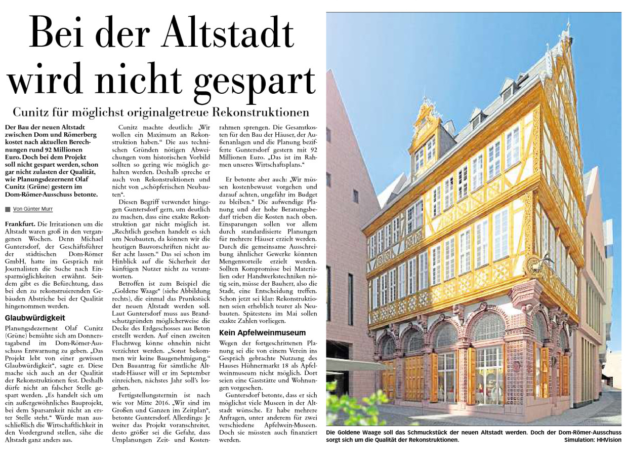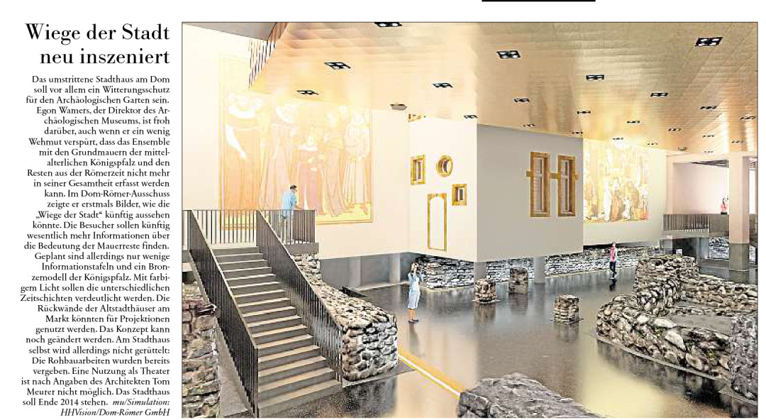 Im Rahmen der letzten Sitzung des Sonderausschuss Dom-Römer wurde das Konzept für den Archäologischen Garten und die aktuellen Planungen für das Stadthaus vorgestellt. Darüber hinaus wurde von Seiten des Planungsdezernats und der Dom-Römer GmbH klargestellt, dass die geplanten Rekonstruktionen auf dem Areal in höchster Qualität ausgeführt werden sollen.