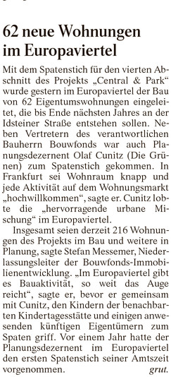 Central and Park Spatenstich 18.03.13 (2)Mit dem Spatenstich am 18. März 2013 von Olaf Cunitz, Bürgermeister und Dezernent für Planen, Bauen, Wohnen und Grundbesitz der Stadt Frankfurt, und Stefan Messemer, Leiter der Hauptniederlassung Bouwfonds Frankfurt, sowie den Erwerbern der Eigentumswohnungen im vierten Bauabschnitt beginnt der Bau der Häuser 13 bis 16 im Central & Park. Vor etwa einem Jahr, am 28. März 2012, hatte Olaf Cunitz mit dem Vorstand von Bouwfonds für rund 370 Eigentumswohnungen – verteilt auf 25 Häuser – in Central & Park südlich des Europagartens im neuen Frankfurter   Europaviertel den Startschuss für die ersten vier Häuser im Central & Park gegeben.