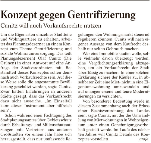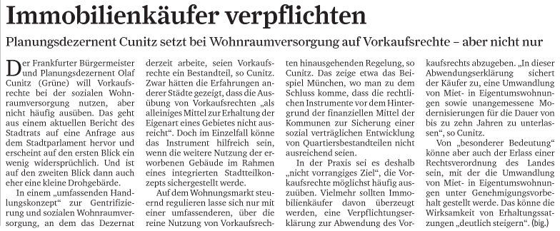 BahnhofsviertelDas Planungsdezernat der Stadt Frankfurt arbeitet derzeit an einem umfassenden Handlungskonzept zum Thema Gentrifizierung und soziale Wohnraumversorgung. Das teilt Bürgermeister und Planungsdezernent Olaf Cunitz in einem aktuellen Bericht auf eine diesbezügliche Anfrage aus der Stadtverordnetenversammlung mit. Ein Bestandteil des Konzepts soll auch die Ausübung von Vorkaufsrechten sein. Auch wenn die bisherigen Erfahrungen anderer Städte zeigen, dass die Vorkaufsrechtsausübung als alleiniges Mittel zur Erhaltung der Eigenart eines Gebietes nicht ausreicht: Im Einzelfall kann dieses Instrument hilfreich sein, wenn die weitere Nutzung der erworbenen Gebäude im Rahmen eines integrierten Stadtentwicklungskonzepts sichergestellt wird.