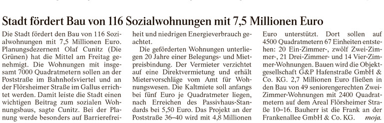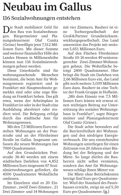 Planungsdezernent Olaf Cunitz hat am heutigen Freitag 7.512.000 Euro an städtischen Wohnungsbaumitteln für den Bau von 116 Sozialmietwohnungen mit fast 7.000 Quadratmetern bewilligt. Dabei handelt es sich um je ein Projekt in der Poststraße und in der Flörsheimer Straße im Gallus. Mit dem Einsatz von über 7,5 Millionen Euro leisten wir erneut einen wichtigen Beitrag zur Unterstützung des sozialen Wohnungsbaus in Frankfurt. Dabei legen wir ein besonderes Augenmerk auf die Barrierefreiheit sowie den Energieverbrauch und kommen unserer sozialen Verantwortung nach.