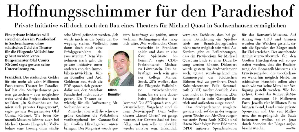 Im Rahmen der letzte Stadtverordnetenversammlung habe ich erklärt, dass die Unterstützung des bürgerschaftlichen Engagements für eine feste Spielstätte für die Fliegende Volksbühne für mich Chefsache ist: „Ich werde mich an die Spitze der Bewegung stellen. Vielleicht kann dann doch noch eine Erfolgsgeschichte daraus werden.“ Was für das Romatikmuseum gilt, sollte auch für Michael Quast und sein Ensemble gelten. Ich hoffe, dass es dafür viele Unterstützer und Mitstreiter gibt. Ich bin auch sicher, dass das eine oder andere Unternehmen dafür zu gewinnen ist.