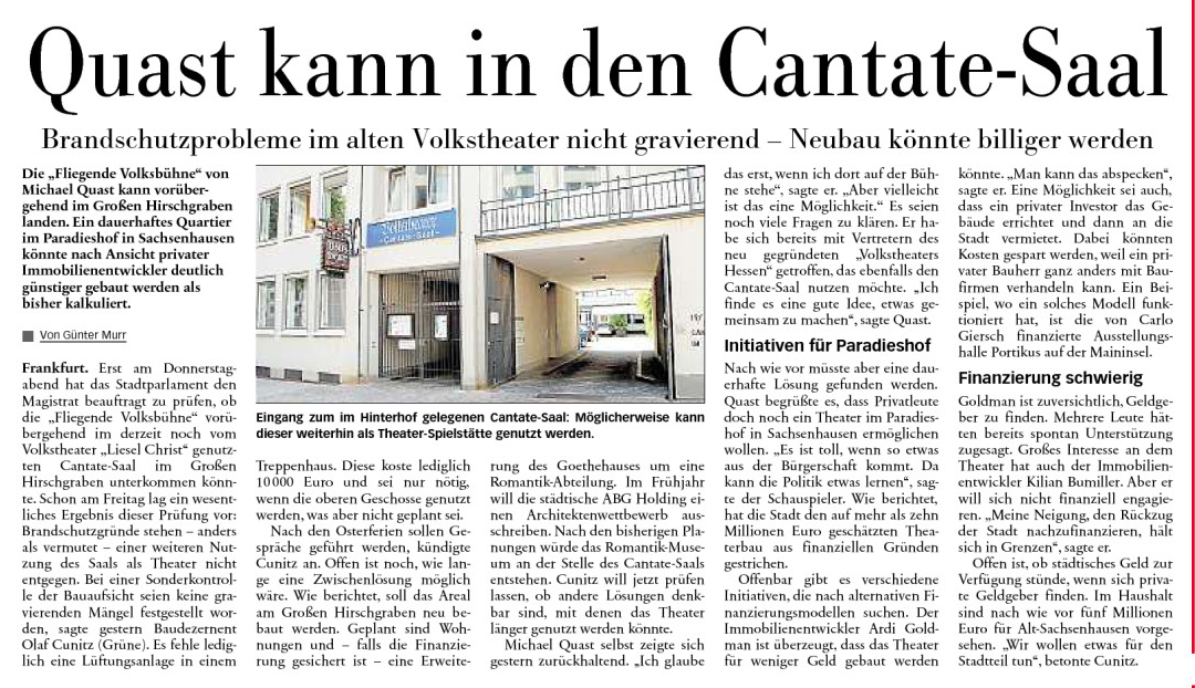 Was den Cantate-Saal angeht, die bisherige Spielstätte des Volkstheaters, so hat die zu meiner Zuständigkeit gehörende Bauaufsicht keine Erkenntnisse, die gegen eine weitere Nutzung als Theater sprechen. Davon habe ich auch umgehend Michael Quast in Kenntnis gesetzt. Vielleicht wäre, das Einverstädnis des Besitzers vorausgesetzt, dadurch eine kurzfristig zu realisierende, vorläufige Lösung möglich. Nach den Osterferien werde ich mich mit Quast treffen und weitere Schritte beraten.